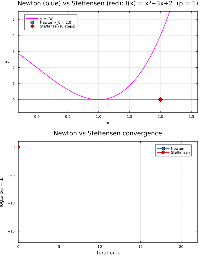 Behavior: Newton–Raphson converges linearly (slowly) to the double root \(p = 1\) of \(f(x) = (x-1)^2(x+2)\). At a double root the asymptotic error ratio is \(\tfrac{1}{2}\), so each step only halves the error. Steffensen’s \(\Delta^2\) acceleration restores superlinear convergence, reaching machine precision in a handful of steps.