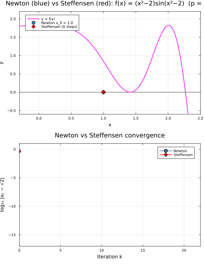 Behavior: The double root \(p = \sqrt{2}\) causes Newton to converge linearly. Steffensen’s acceleration applied to the Newton iterates recovers rapid convergence, dropping to machine precision far sooner.