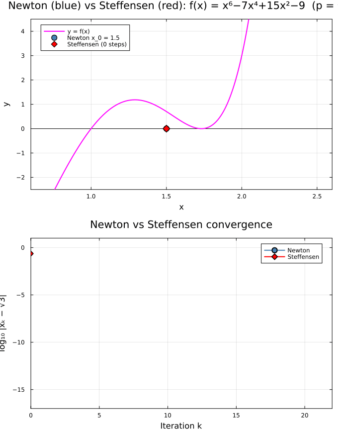 Behavior: \(f(x) = (x^2-1)(x^2-3)^2\) has a double root at \(p = \sqrt{3} \approx 1.732\). Newton’s linear crawl is visible in both the tangent-line panel and the gently sloping error curve; Steffensen converges in only a few Aitken-accelerated steps.