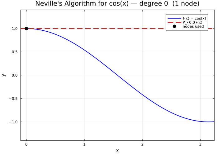 The animation below illustrates Neville’s algorithm for polynomial interpolation of \(f(x) = \cos(x)\) at 5 nodes \(x_0 = 0,\, \tfrac{\pi}{4},\, \tfrac{\pi}{2},\, \tfrac{3\pi}{4},\, \pi\). Each frame adds one node, building successively higher-degree interpolants \(P_{0,j}(x)\).