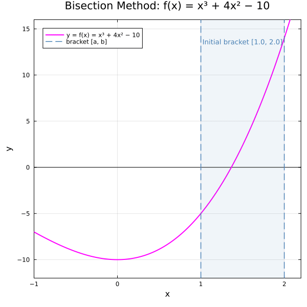 Behavior: \(f(1) = -5 < 0\) and \(f(2) = 14 > 0\), so the IVT guarantees a root in \([1, 2]\). The true root is \(x^* \approx 1.3688\). The bracket halves each step and the midpoints converge monotonically.