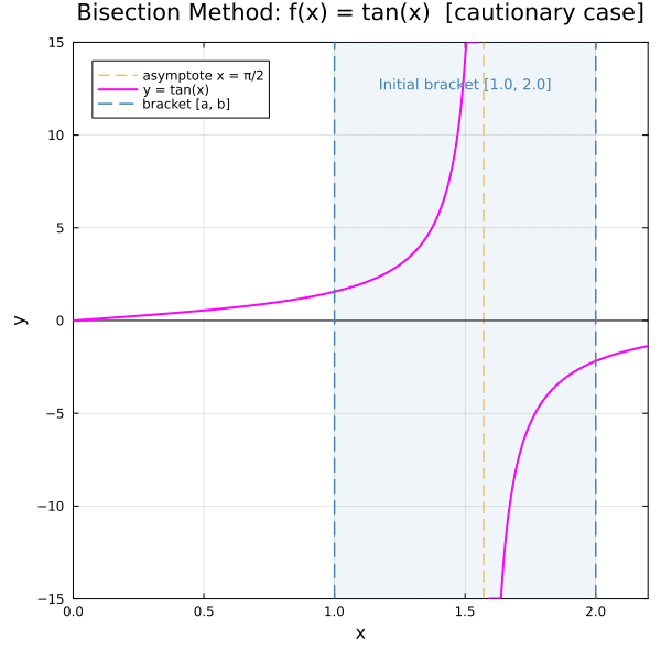 Behavior: \(f(1) = \tan(1) > 0\) and \(f(2) = \tan(2) < 0\), so there is a sign change on \([1, 2]\). However, this sign change is caused by the vertical asymptote at \(x = \tfrac{\pi}{2} \approx 1.5708\), not a true root. Bisection converges to the asymptote — illustrating that the IVT guarantee requires \(f\) to be continuous on \([a, b]\).