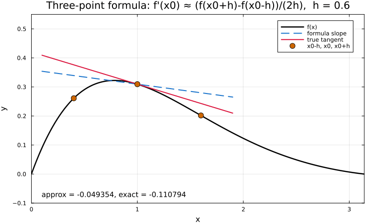 Behavior: The symmetric three-point slope converges to the tangent slope as \(h\) decreases, reflecting second-order accuracy.