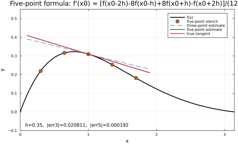 Animation showing five-point stencil samples and comparison of three-point versus five-point slope estimates as h decreases.