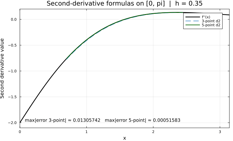 Behavior: The curve profiles compare \(f''(x)\) against the three-point and five-point second-derivative stencils over \([0,\pi]\). As \(h\) decreases, both improve, and the five-point stencil stays noticeably closer because it cancels lower-order truncation terms.