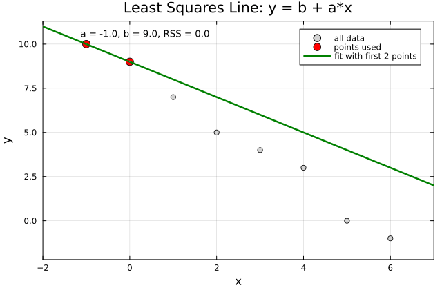 Behavior: The unconstrained fit minimizes vertical residuals to a straight line. As points are added, the slope and intercept stabilize near \(a \approx -1.6071\) and \(b \approx 8.6429\).
