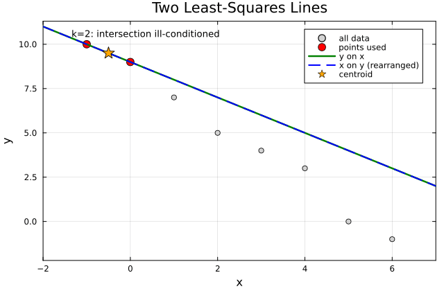 Behavior: Fitting \(y\) as a function of \(x\) and fitting \(x\) as a function of \(y\) produce two distinct lines in the \(x\)-\(y\) plane. Their intersection coincides with the centroid of the data, here approximately \((\bar{x}, \bar{y}) = (2.5, 4.625)\).