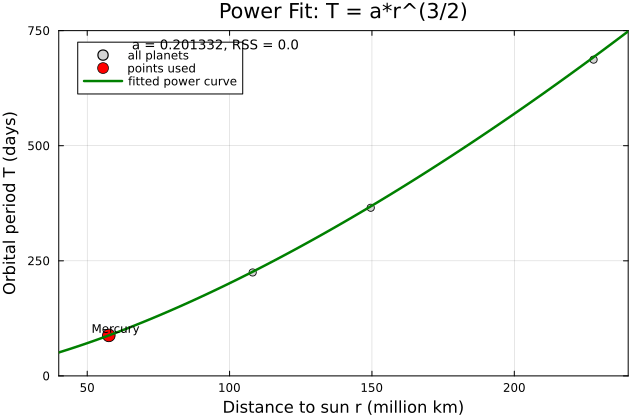 Behavior: With exponent fixed at \(3/2\), the power law is linear in \(a\) after choosing basis function \(r^{3/2}\). Using Mercury, Venus, Earth, and Mars data gives \(a \approx 0.19977\).