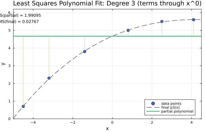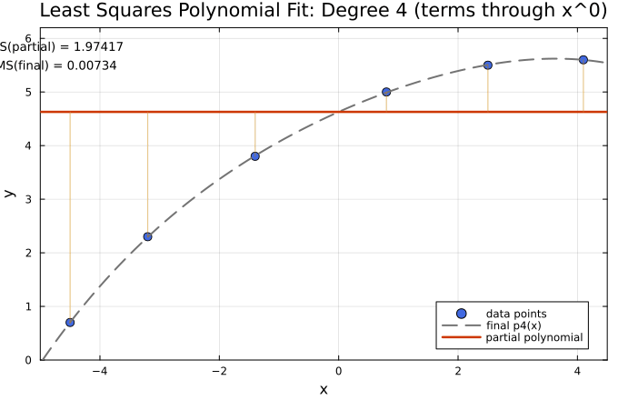 Each animation below shows the term-by-term construction of the least-squares polynomial fit for the same dataset. The blue points are the data, the gray dashed curve is the final fitted polynomial, and the solid colored curve is the partial polynomial built from terms up to degree \(k\).
