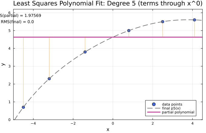 Behavior: With six data points and degree 5, the polynomial interpolates all points essentially exactly, so RMS is near machine precision. This illustrates why a degree-\(n-1\) polynomial can match \(n\) distinct points, but it may still be fragile for extrapolation.