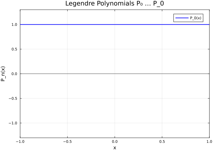 Properties: Each \(P_n\) is orthogonal to all lower-degree Legendre polynomials on \([-1,1]\). \(P_n(1)=1\), \(P_n(-1)=(-1)^n\), and \(P_n\) has exactly \(n\) zeros in \((-1,1)\). They are computed by the recurrence \((n+1)P_{n+1} = (2n+1)xP_n - nP_{n-1}\).