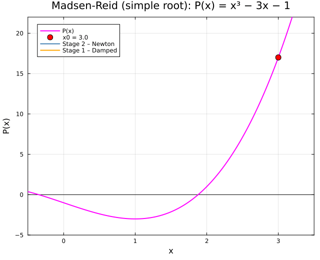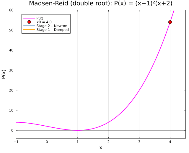 Behavior: \(P(x)\) has a double root at \(x^* = 1\) where \(P'(x^*) = 0\). Standard Newton-Raphson would converge only linearly here. The Madsen-Reid acceleration mechanism — growing \(r_0\) fivefold each step — allows the iterates to accelerate past the stalling zone, recovering faster-than-linear convergence. Orange (Stage 1) frames show where the step is damped to control overshoot; blue (Stage 2) frames show the accelerated Newton phase. The simple root at \(x = -2\) may also be found depending on which root the deflation targets first.