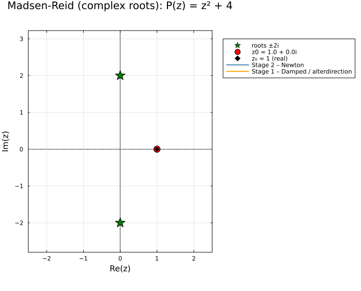 Behavior: The roots are \(z^* = \pm 2i\) — there are no real roots. Starting on the real axis at \(z_0 = 1\), the real-axis Newton iterates cannot reach a real root and stagnate. The alterdirection mechanism rotates the step into the complex plane, allowing the iterates to escape the real axis. The path traces a curved trajectory in \(\mathbb{C}\) converging to \(z^* = +2i\). Blue segments are Stage 2 Newton steps; orange segments with direction changes are the alterdirection escapes. This case illustrates how the algorithm handles polynomials with no real roots starting from a real initial guess.