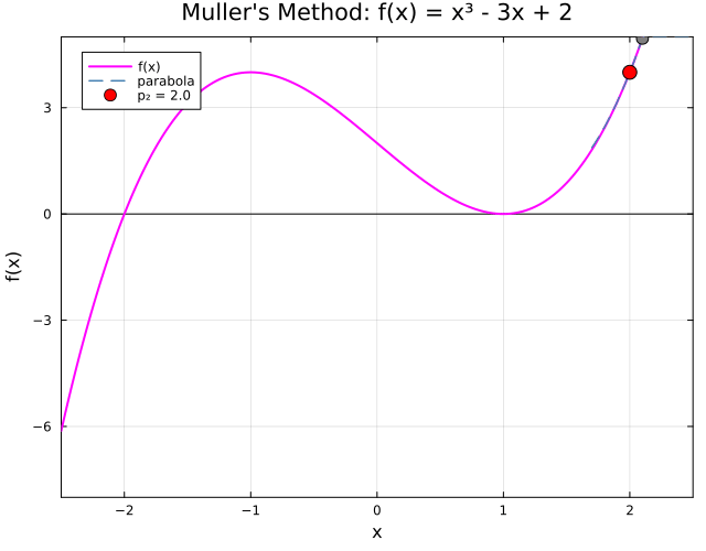 Behavior: The method converges to the double root \(p = 1\) of \(f(x) = (x-1)^2(x+2)\). Starting near \(p_2 = 2.0\), the iterates approach \(p = 1\) with order \(\approx 1.84\) convergence — faster than Newton’s method, which has only linear convergence on double roots.