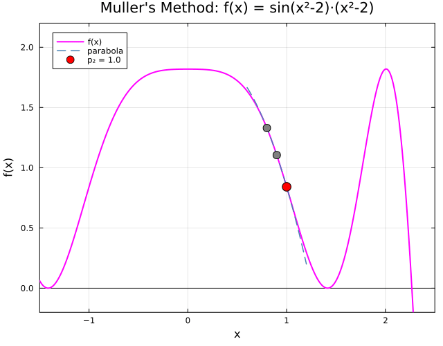 Behavior: The method converges to the double root \(p = \sqrt{2} \approx 1.4142\) starting from \(p_2 = 1.0\). The function has a double root where \(x^2 - 2 = 0\) since both factors vanish simultaneously, and Muller’s method locates it efficiently despite the flat tangent at the root.