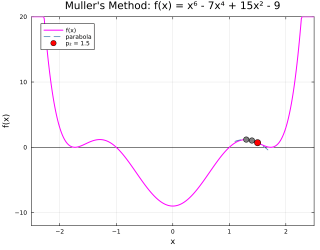 Each animation below shows Muller’s Method fitting a parabola through three successive approximations of a root. The parabola (dashed blue) passes through the current triple \((p_0, p_1, p_2)\), and the next iterate is found where the parabola crosses the x-axis. Each frame advances one iteration: the oldest point is dropped, and the new root estimate becomes \(p_2\) (red dot). The gray dots are \(p_0\) and \(p_1\).