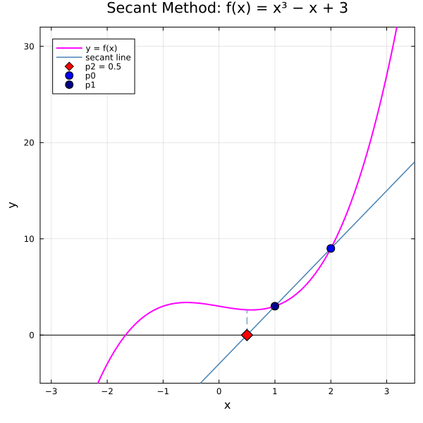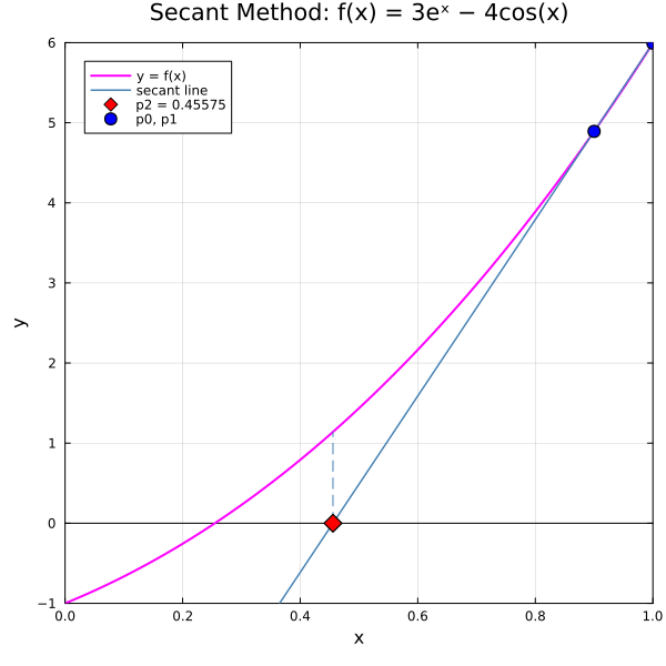 Behavior: The secant method converges quickly to the root near \(x \approx 0.456\). Both starting points are on the same side of the root and the function is well-behaved, so the secant line immediately produces a good approximation.