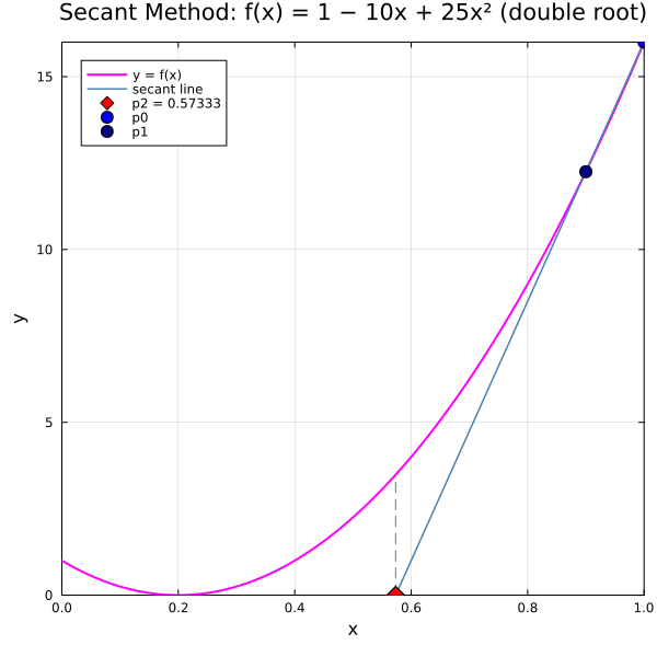 Behavior: The function \((1-5x)^2\) has a double root at \(x = 0.2\) where \(f'(0.2) = 0\). The secant method converges, but slowly — the double root causes the denominator \(f(p_n) - f(p_{n-1})\) to shrink, giving small steps that creep toward the root over many iterations.