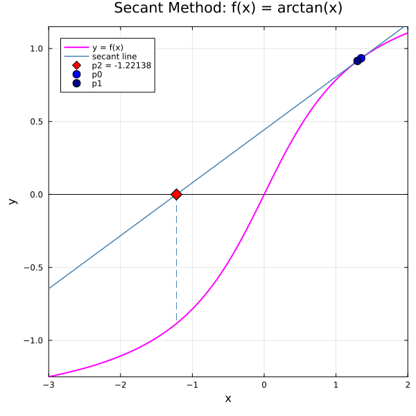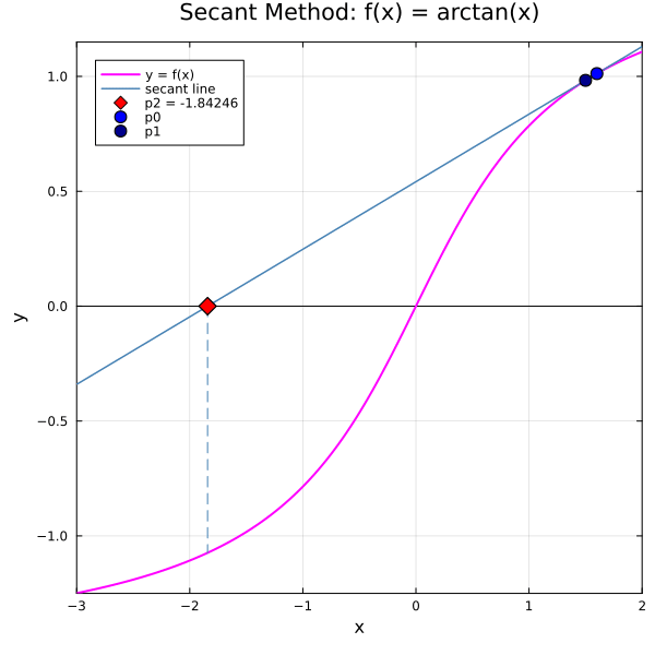 Behavior: The secant method converges to the root at \(x = 0\), but the iterates oscillate — jumping to the opposite side of the root each step before settling. The relatively flat slope of \(\arctan\) near the starting points causes the secant line to overshoot to negative \(x\) on the first step.
