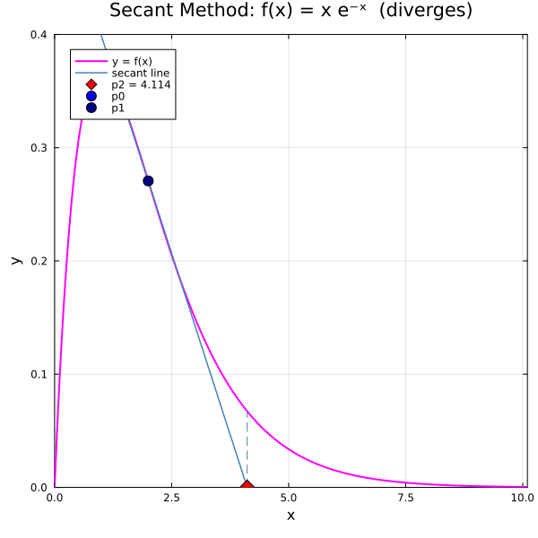 Behavior: Although \(f(x) = x e^{-x}\) has a root at \(x = 0\), the secant method diverges with these starting points. The function decreases toward zero for large \(x\), so the secant line through points on the decaying tail has a shallow negative slope whose x-intercept falls far to the right — each step pushes the estimate further from the root.