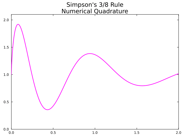 Each animation below shows the Simpson’s 3/8 rule diagram over \([0,2]\) for \(y = e^{-x}\sin(8x^{2/3})+1\). Each frame recomputes the approximation across the full interval with a denser partition where \(n\) remains a multiple of 3.