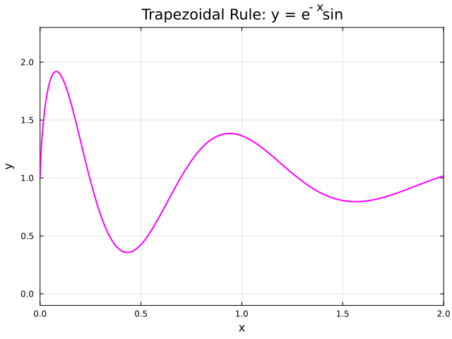 Case 1 — Trapezoidal Rule, \(y = e^{-x}\sin(8x^{2/3})+1\), \(n=10\)