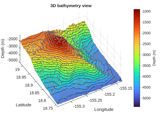 clc;clear;closeall;data=load('a01_etopo_loihi.mat');x=double(data.x);y=double(data.y);z=double(data.z);xLimits= [min(x),max(x)];yLimits= [min(y),max(y)];xGrid= {linspace(xLimits(1) -eps(xLimits(1)),xLimits(2) +eps(xLimits(2)),480),...linspace(yLimits(1) -eps(yLimits(1)),yLimits(2) +eps(yLimits(2)),481)};smoothness=0.000001;zGrid=regularizeNd([x,y],z,xGrid,smoothness,'cubic');% equivalents ways to call regularizeNd% zGrid = regularizeNd([x,y], z, xGrid, smoothness, 'cubic', 'normal');% Upsample grid since we are using cubic interpolationzFunction=griddedInterpolant(xGrid,zGrid);xGrid2= {linspace(xLimits(1) -eps(xLimits(1)),xLimits(2) +eps(xLimits(2)),2000),...linspace(yLimits(1) -eps(yLimits(1)),yLimits(2) +eps(yLimits(2)),2001)};xGrid2Expanded=cell(2,1);[xGrid2Expanded{:}] =ndgrid(xGrid2{:});zGrid2=zFunction(xGrid2Expanded{1},xGrid2Expanded{2});surf(xGrid2{:},zGrid2','EdgeColor','none','FaceColor','interp')holdon;contour3(xGrid2{:},zGrid2',22,'k','LineWidth',0.45)GRAY= [0.50.50.5];scatter3(x,y,z,10,GRAY,'filled')colormap(turbo(256))clim([-5400-900])view(329.7,61)xlabel('Longitude')ylabel('Latitude')zlabel('Depth (m)')gridonaxistighttitle('3D bathymetry view')ylabel(colorbar,'Depth (m)')