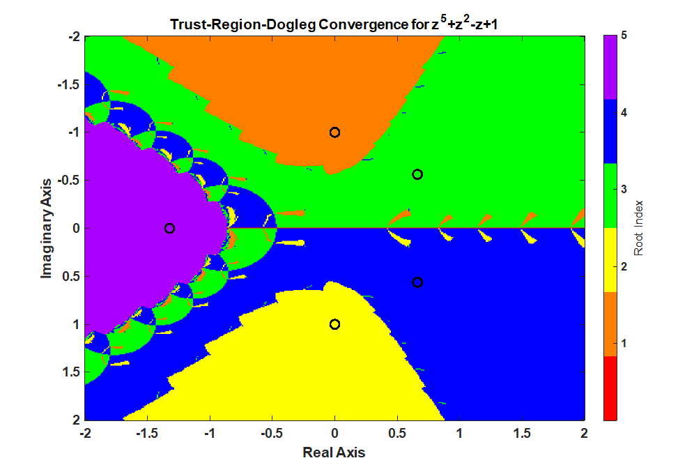 The MATLAB fsolve() function uses the Trust-Region-Dogleg method to find a root of a nonlinear equation. What’s interesting is how much smoother the boundaries are for the Trust-Region-Dogleg method.